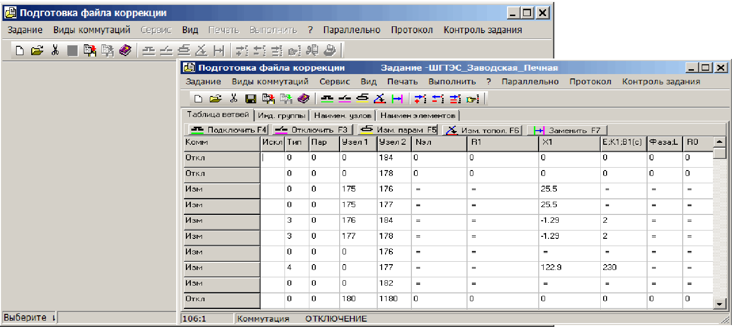 Программа позволяет подготовить файл изменений сетевых данных по прямой (обратной), нулевой последовательностям и индуктивным группам. При желании можно изменить наименования существующих в изменяемой сети узлов и элементов или задать наименования новых узлов и элементов.